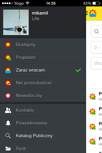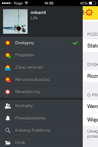 Oczywiście, czym byłoby GG bez statusu? W aplikacji możemy dowolnie stworzyć opis naszego konta, jak również wybrać jedną z kilku opcji statusu, takich jak "dostępny" czy "zaraz wracam".